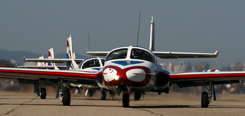 写真1 演技飛行に向けタキシーアウトしたブラックイーグルスのA-37B。(2007年10月20日ソウルエアショー)
