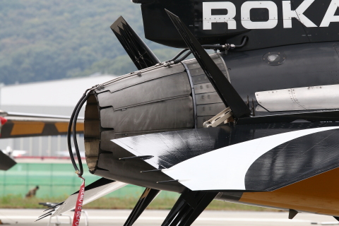 写真13 垂直尾翼後部の基部左右からスモークパイプが伸びている。地上展示中はスモークパイプ先端を保護するためのチューブを付けている。(ADEX 2025/ 2025年10月18日)